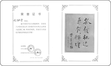 1997年3月,劉繼宗董事長(zhǎng)被邀請(qǐng)參加“全國(guó)百名優(yōu)秀企業(yè)家大會(huì)”,業(yè)績(jī)被收入大型紀(jì)實(shí)叢書《中國(guó)百名優(yōu)秀企業(yè)家奮斗史》第二卷